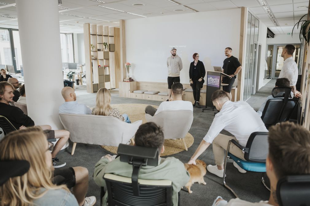 Kanceláře máme ve Futurama Business Parku v Karlíně. Máme tady open office a když se někdo potřebuje focusovat na práci, máme tiché zasedačky nebo sluchátka. Effectix je jinak prostředí pulzující energií. Otevřené dveře mají děti i všichni čtyřnozí parťáci, kteří nám pravidelně zpříjemňují den.