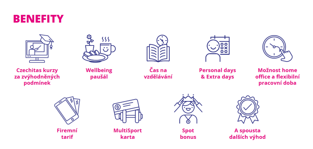 Nabízíme i spoustu benefitů, které si můžeš prohlédnout na obrázku níže. Tím hlavním je ale práce v inspirativním prostředí, které podporuje osobní růst – ať už skrze pravidelný rozvoj a prostor na vzdělávání nebo díky vysoké míře flexibility s možností hybridního režimu a přizpůsobení pracovní doby. Těšit se navíc můžeš na práci, která má společenský dopad a smysl. Jako Partnerships Specialist budeš jednou z klíčových osob organizace zajišťující financování Czechitas, díky tomu budeš mít neodmyslitelný podíl při naplňování naší mise, aby se ženy staly srdcem technologické transformace Česka. Přestože máme kanceláře v Praze i Brně, potěšit by tě také mohla hybridní forma spolupráce s neomezenou možností práce na HO.